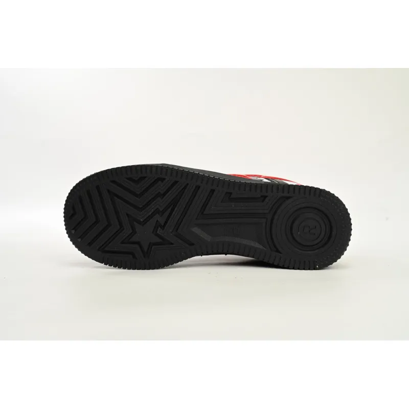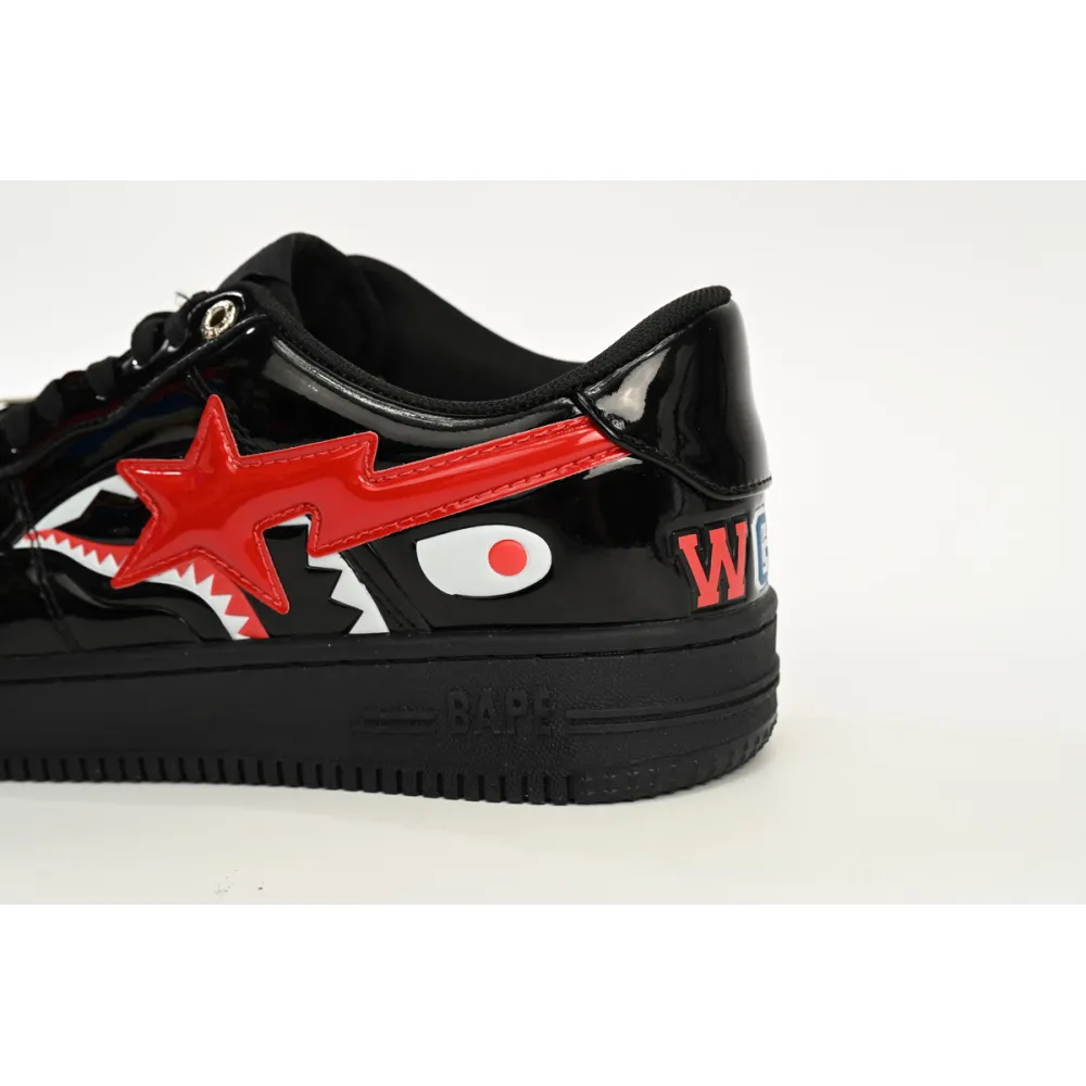 January of 2019 saw A Bathing Ape release the Bapesta Low 'Black Shark Face' sneaker, a low top model featuring the brand's famous Shark Face theme. Clearly taking inspiration from Nike's Air Force 1, the upper comes in a shiny patent leather, with the shark taking up much of the vamp in red, black and white. The label's star logo swoops across the midpanel in red, and details such as a perforated toe box and branded metal dubrae top off the look.